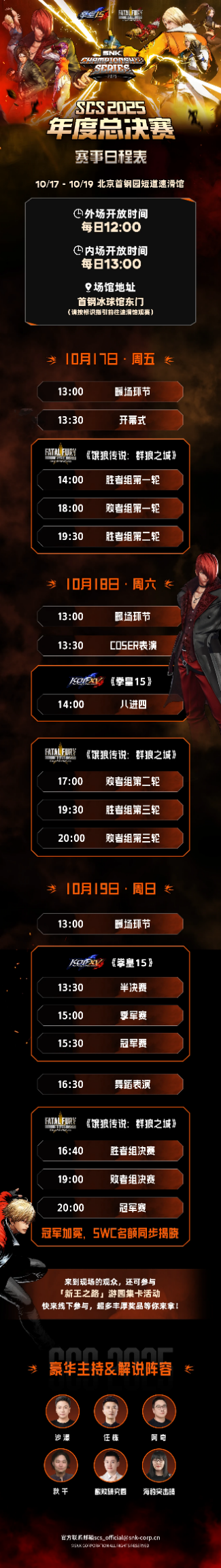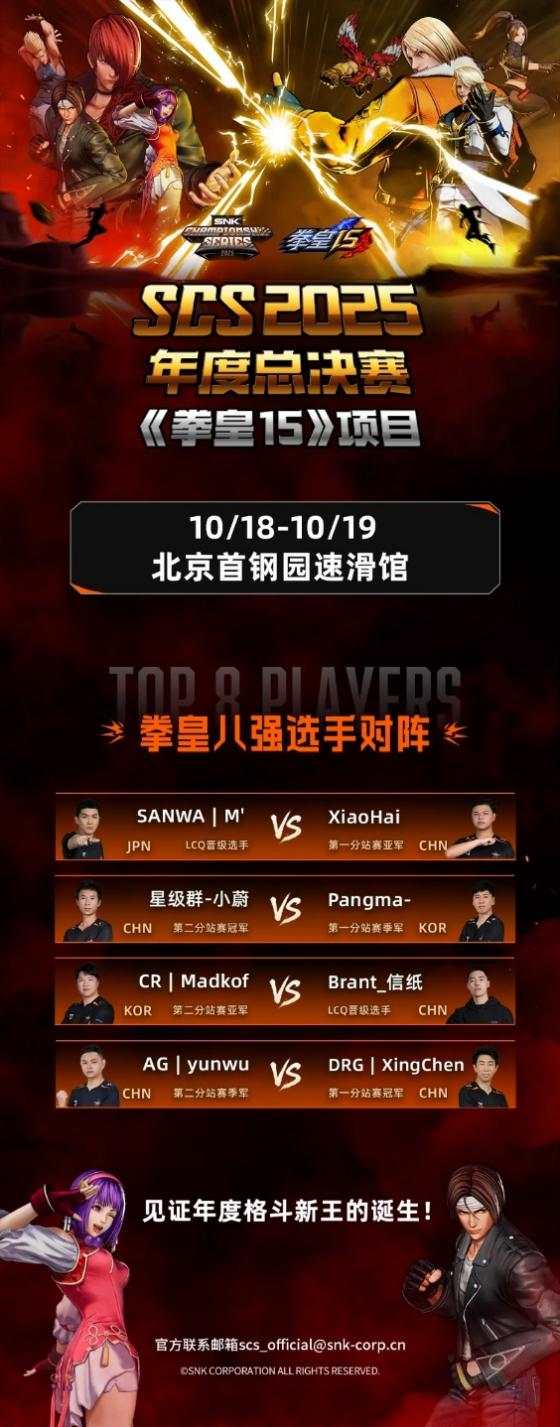 由株式会社SNK主办的SCS 2025(SNK冠军系列赛 2025)年度总决赛,将于10月17日至19日在北京首钢园举行。届时,将诞生《拳皇15》《饿狼传说:群狼之城》两大项目年度总冠军,并揭晓SWC 2025直通人选。