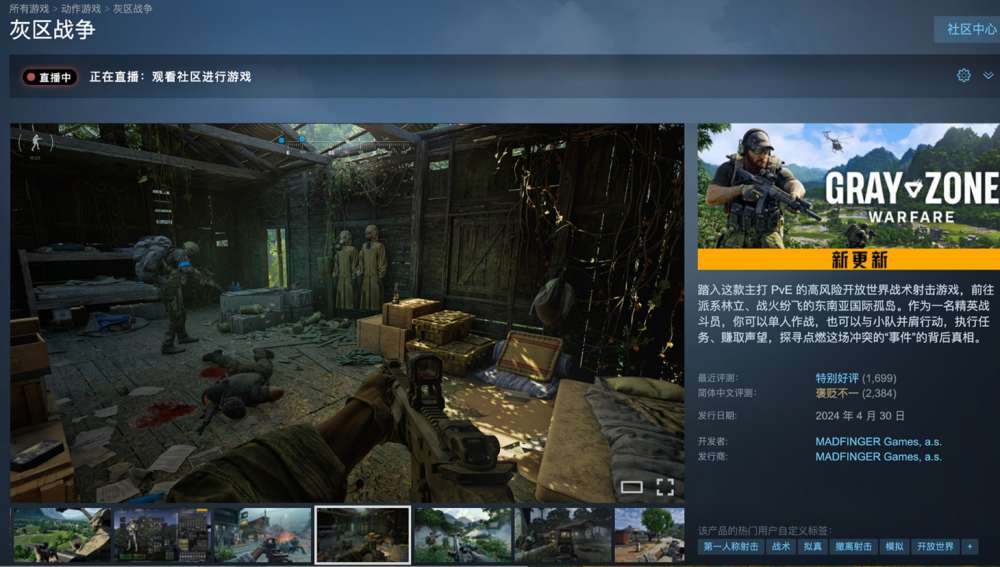 最近几年,搜打撤玩法的射击游戏越来越丰富,同类竞争也愈发激烈。2024年4月,捷克MADFINGER Games开发的《灰区战争》,凭借其独特的开放环境撤离式玩法,在短短几周内就突破了百万销量的里程碑。