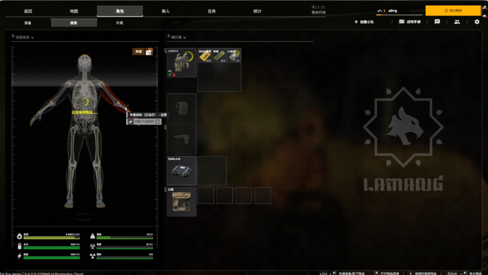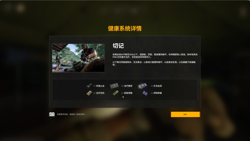 游戏舍弃了传统的生命值系统,转而采用部位伤害模型。玩家的身体被分为不同区域,每个部位的受伤会带来不同的影响:腿部受伤影响移动速度,手臂受伤影响瞄准稳定性,内脏受损则可能导致持续失血甚至死亡。治疗手段也相应细分为多种类型:绷带处理撕裂/贯穿伤,止血带用于止血,夹板修复骨折,手术包修复受损器官。与以往很多射击游戏不同,游戏在“治疗”这一赛道上走得很远,多种治疗动画带来了更真实的体验,也让生存玩法更加硬核。